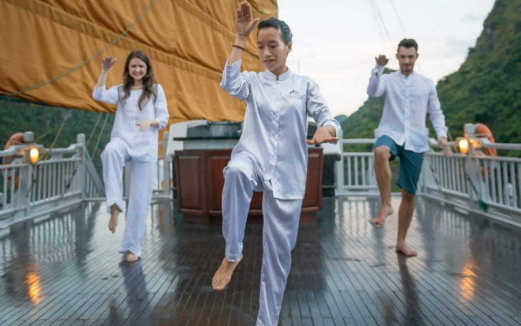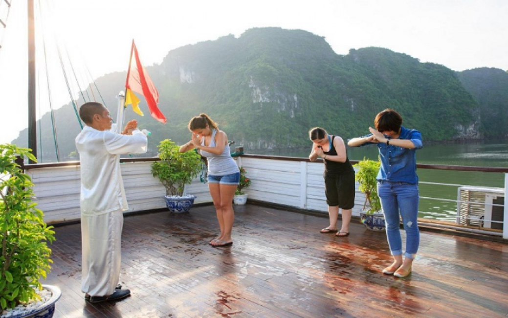 Tourists kayaking in Halong BayActivities: Tai Chi morning, swim, climb hill