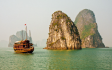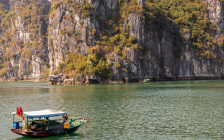 Then it is time for an early morning bath – in the Bay. By tender boat we bring the guests to a natural white sandy stretch of a beach with crystal clear water. Sporty ones can climb up to a hill top to have a last view from above over the Halong Bay before we return to the boat and cruise slowly back to Halong City, passing picturesque areas like the Titop Island, the Tam Cung Cave and Poem Mountain.